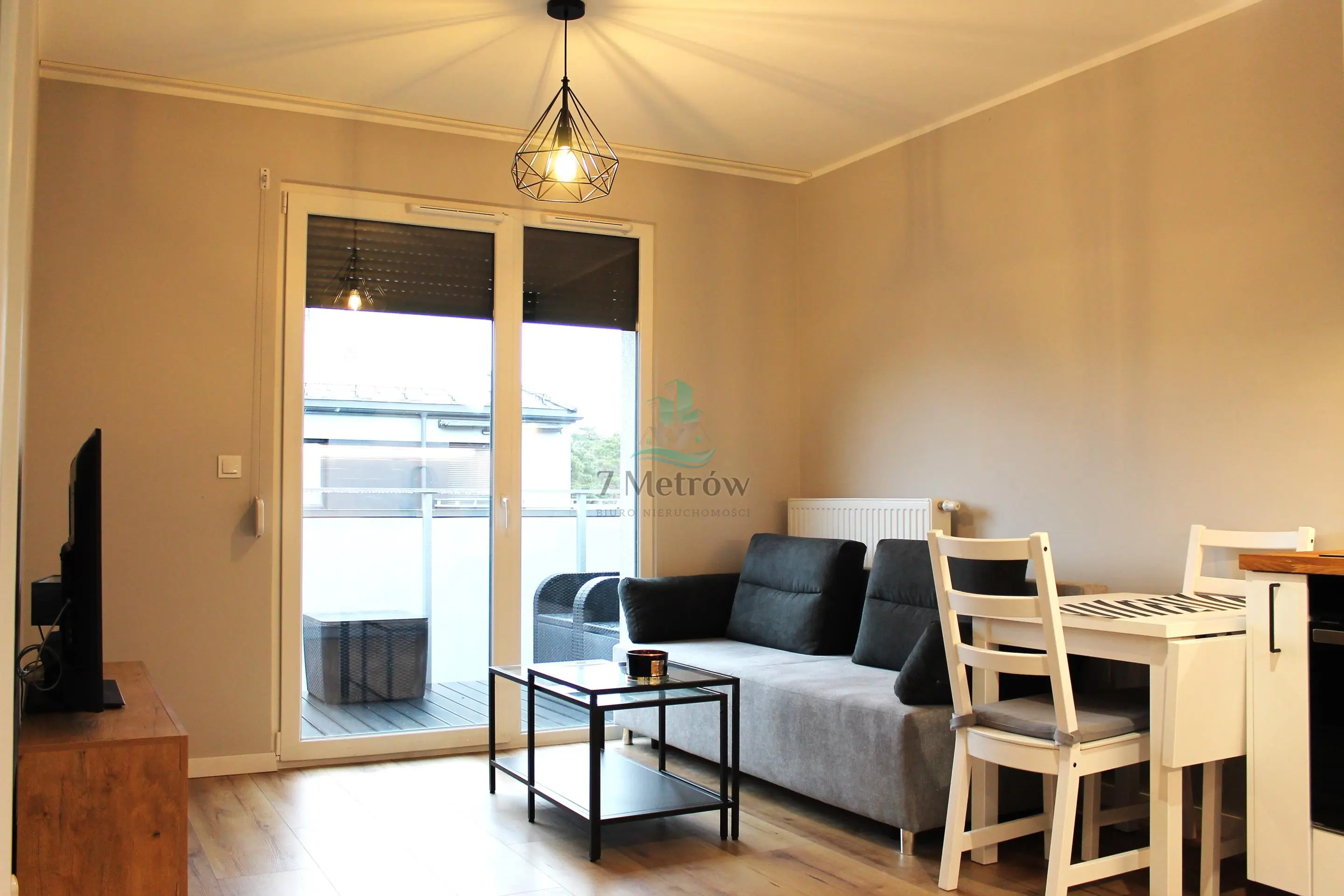 W salonie znajduje się 50" telewizor, wygodna kanapa oraz stolik z krzesłami. Prowadzi z niego wyjście na duży balkon.