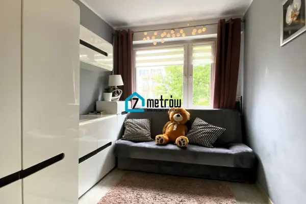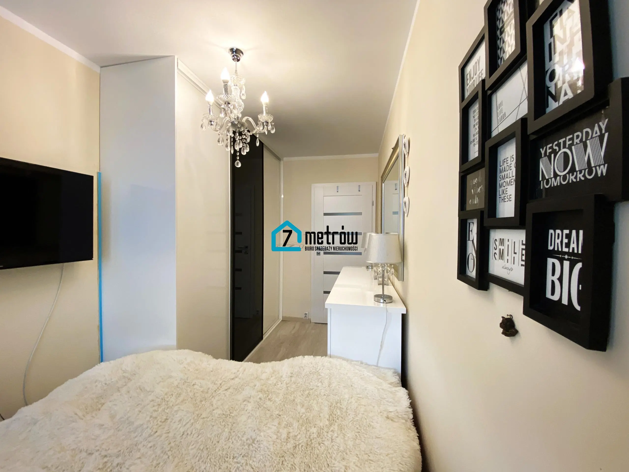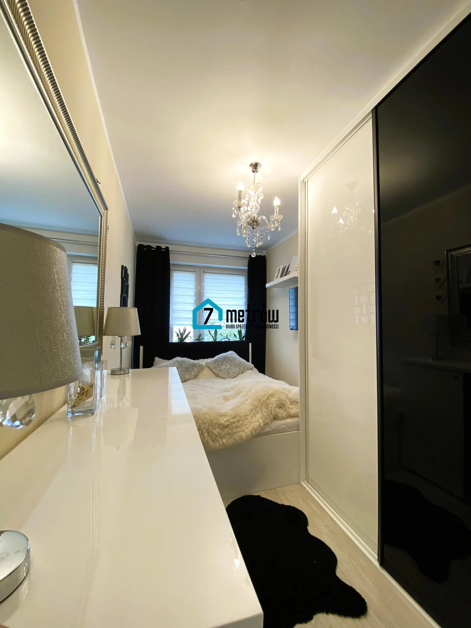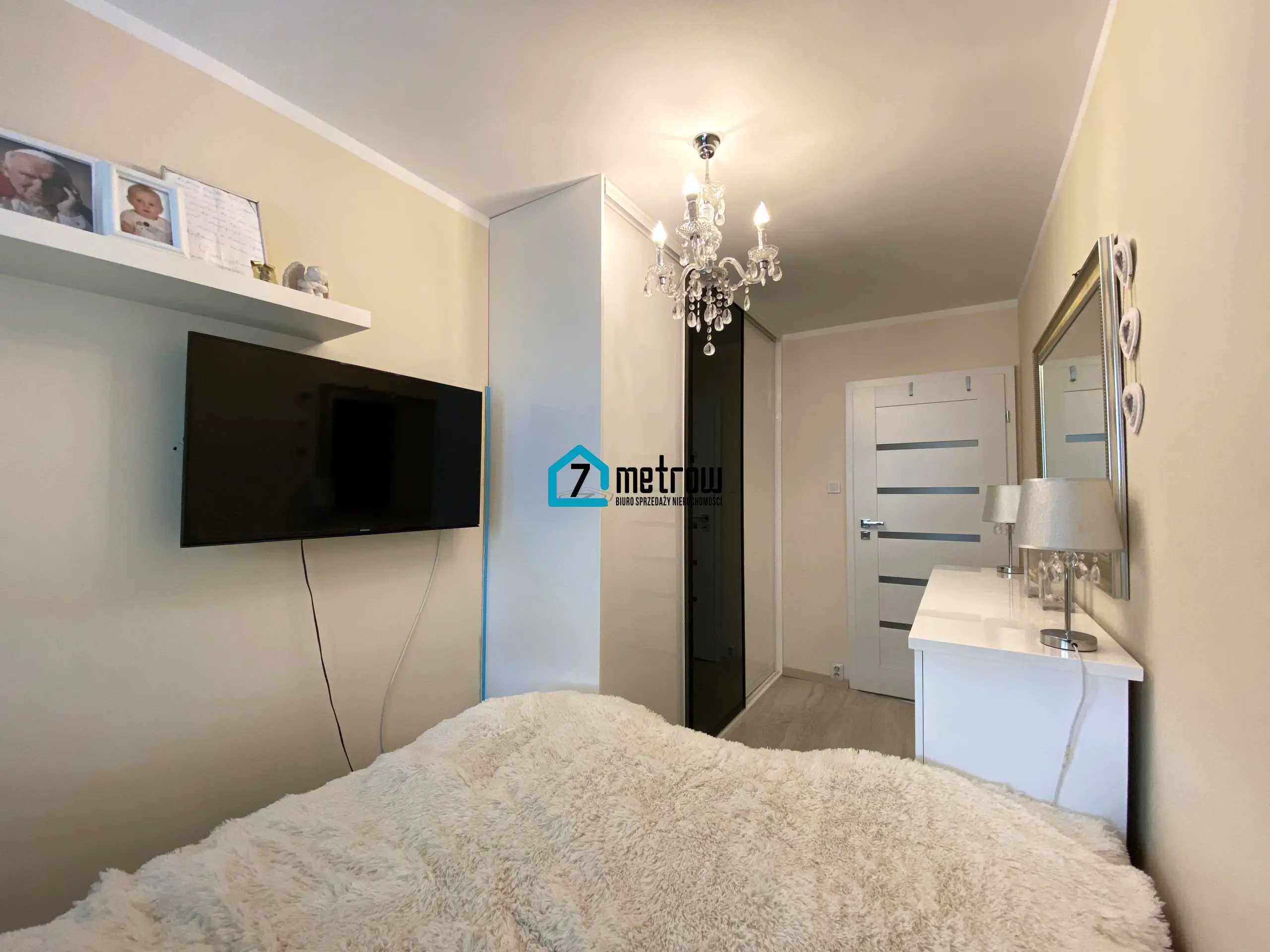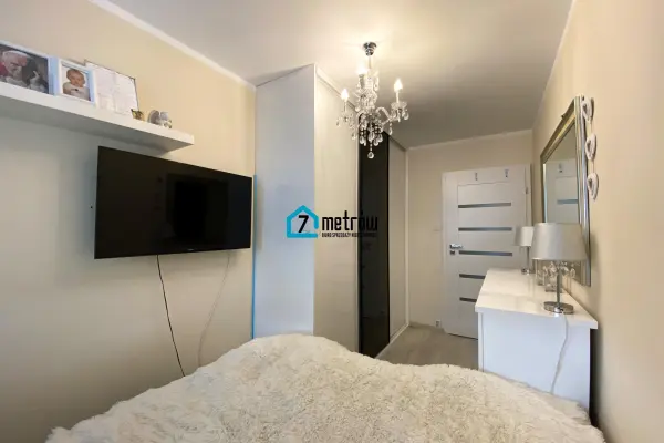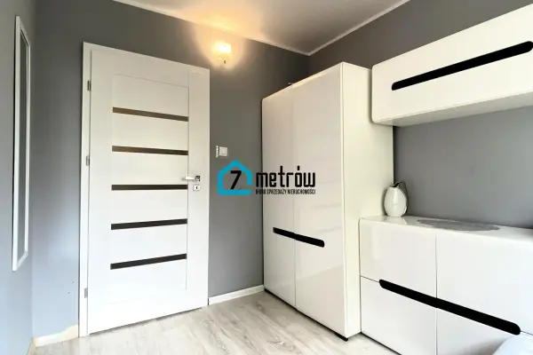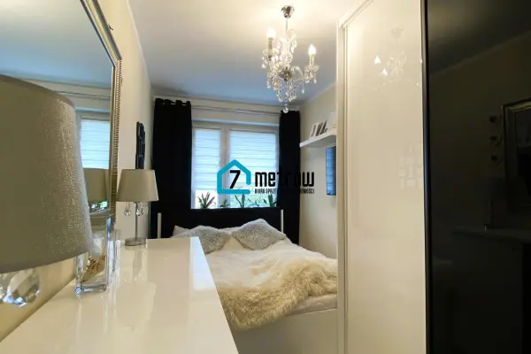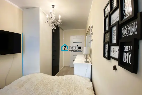 W sypialni znajduje się duże łózko, pojemna szafa typu komandor oraz komoda, w przedpokoju jest szafa typu komandor.
