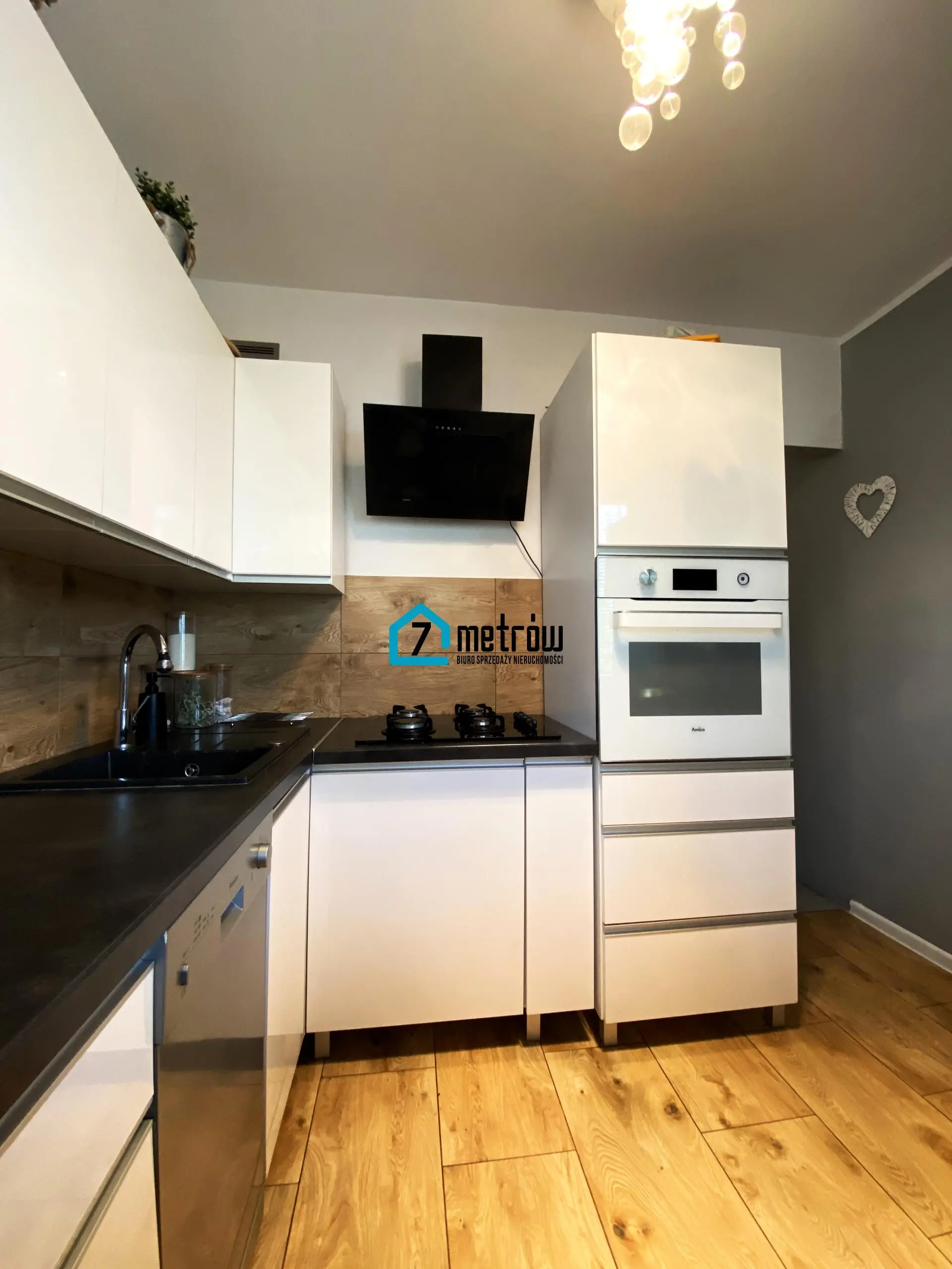 Kuchnia w zabudowie wraz z całym wyposażeniem (zmywarka, lodówka, płyta indukcyjna, wbudowany piekarnik, lodówka, okap).